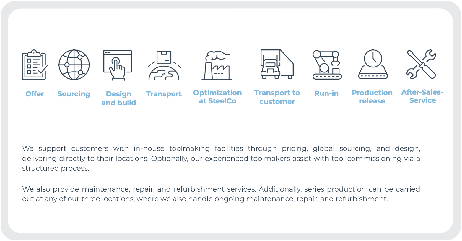 We know from experience that production must run as smoothly as possible and without downtime in order to be economically successful. This is why SteelCo. Tech also takes over tools from its customers or other suppliers, for example in the event of machine downtimes or capacity bottlenecks.